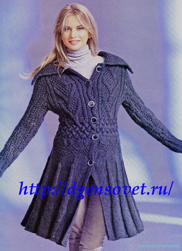 Сборка: выполнить плечевые швы. На короткие круговые спицы N» 7 набрать двойной нитью по вырезу горловины без коротких сторон планок полочек 65 п. и вязать платочной вязкой воротник. На высоте воротника 2,5 см = 6 р. равномерно прибавить для расширения 6 п. и в каждом 8-м р. 3 х 4 п. = 83 п. На высоте воротника 16,5 см = 40 р. все петли закрыть лиц. Выполнить швы рукавов и втачать рукава. Пришить нижнюю часть коротким краем к наборному краю верхней части, при этом пришить с обеих сторон планку + по 0,5 см лиц. глади к планкам полочек, между ними припосадить край нижней части. Пришить пуговицы, при этом по 1 пуговице пришить на начало и конец плетеного узора и застегнуть их через первое или последнее перекрещивание. Обвязать нижний край двойной нитью 1 р. «рачьего шага» (= ст. б/н слева направо).
