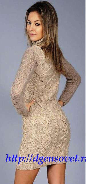 Теплое вязаное платье, украшенное эффектным узором кос, выгодно подчеркивает фигуру и очень комфортно в носке.