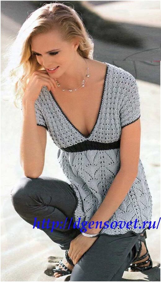 Спинка: на спицы № 4,5 набрать темно-серой нитью 107 (117) п. и связать 1 изн. р. лиц. (этот ряд не учитывается при дальнейшем счете). Затем вязать светло-серой нитью в указанной последовательности. Через 35 см = 94 р. от наборного края перейти на спицы № 3.5 и вязать темно-серой нитью резинкой планку талии, при этом при смене цвета вязать 1-й р. лиц. После 1-го р. в работе находятся 97 (107) п. На высоте планки талии 4 см = 14 р. перейти на спицы № 4.5 и продолжить работу светло-серой нитью полосатым узором с дырочками, при этом при смене цвета вязать 1-й р. лиц. Одновременно от планки талии прибавить для придания формы с обеих сторон в каждом 10-м р. 5 х 1 п. = 107 (117) п., включая прибавляемые п. в узор. Через 24.5 см = 66 р. от планки талии закрыть для скосов рукава/плеча с обеих сторон 3 п. и в каждом 2-м р. 6 х 3 и 3 х 4 п. (1 х 3 и 8 х 4 п.). Через 32 см = 86 р. от планки талии закрыть оставшиеся 41 п.. при этом средние 33 п. образуют вырез горловины, внешние 4 п. с каждой стороны относятся к плечам.