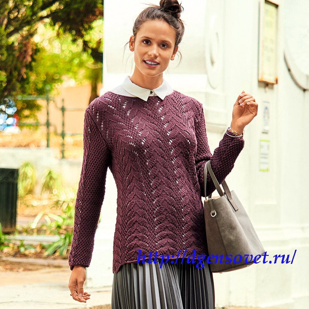 Пряжа (55% натуральной шерсти, 45% хлопка; 130 м/50 г) — 450 (550) г цв. вина; спицы №4,5; круговые спицы №4.