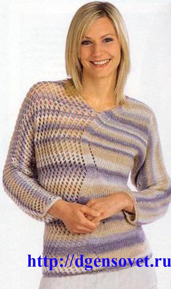 Что-то новое в вязании всегда интересно, а как известно, новое это хорошо забытое старое, вот и эта модель пуловера вяжется с уже знакомым нам рукавом летучая мышь. Но сколько новый деталей: ассиметрия в рисунке — одна его сторона связана ажурным рисунком с накидами, а другая вяжется гладко. Для его вязания вам потребуются круговые спицы и желание вязать.