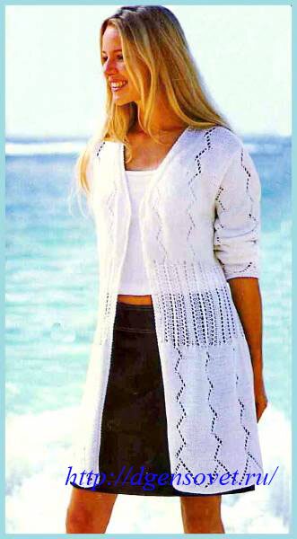 Вам потребуется: 650 г белой пряжи (100% хлопка, 110 цЯО г); спицы № 3.5; крючок №3; 6 пуговиц.